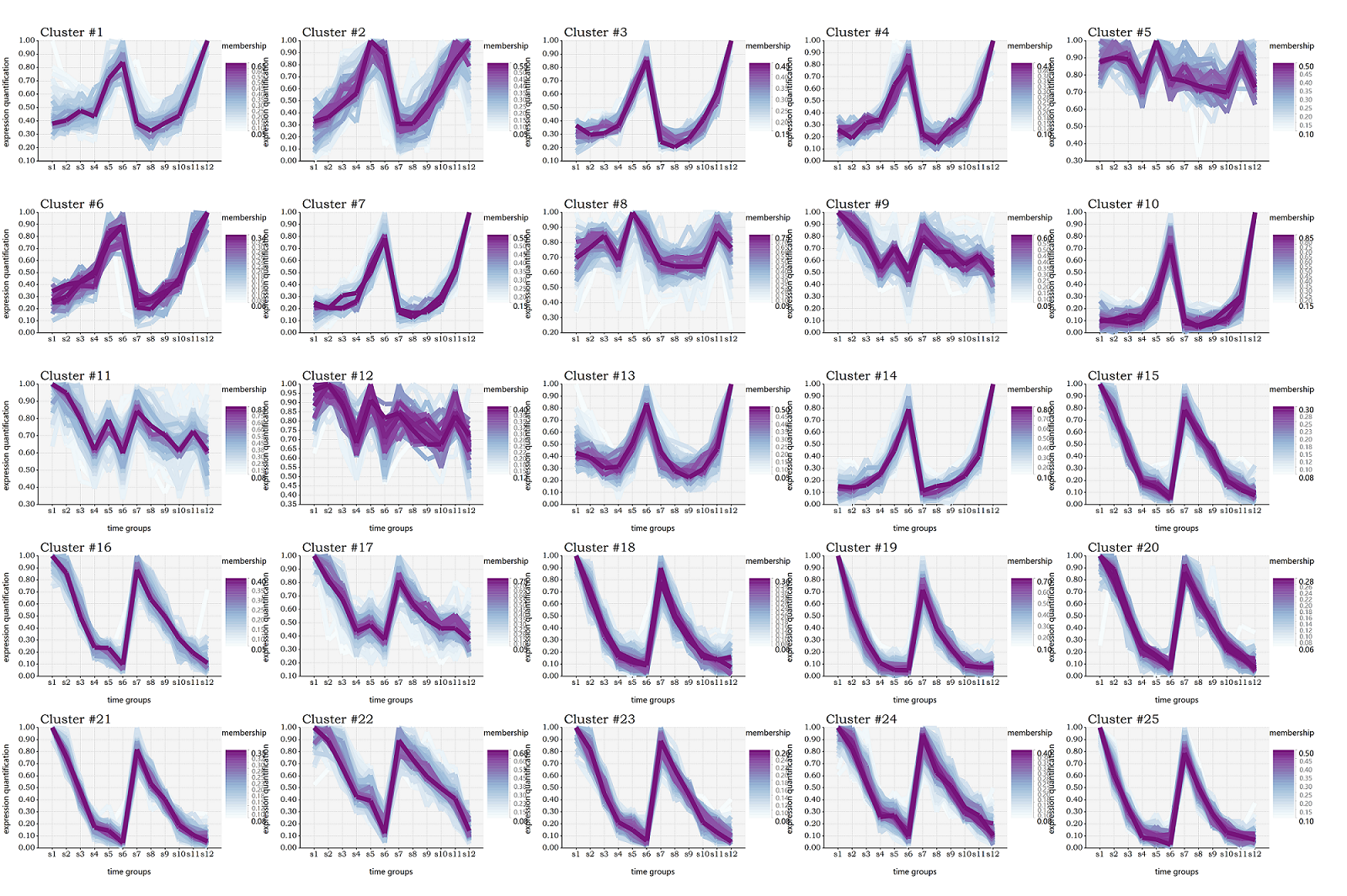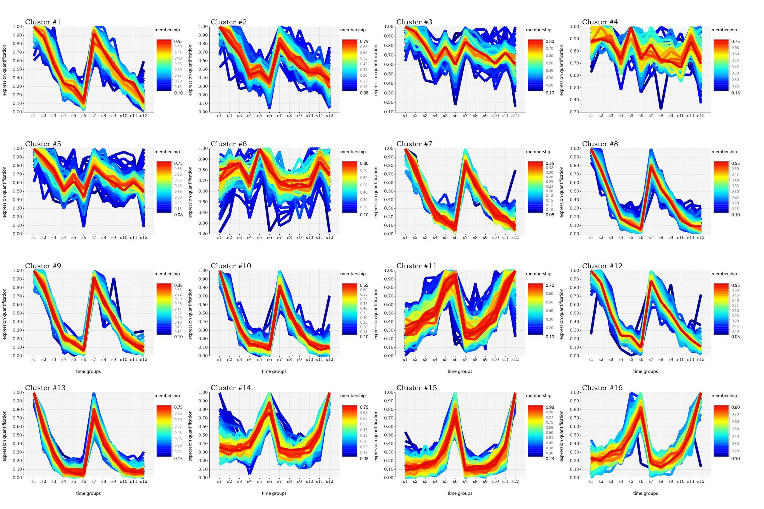 在上面的结果图之中,一个cluster就是对一群表达量变化趋势很相似的基因的集合的在时间上的表达量可视化。上面的可视化图之中,X坐标轴为时间序列或者我们的实验分组,Y坐标轴则是进行数据缩放后得到的相对的表达量值。在每一个图标之中,我们对每一个基因的表达量都绘制了一条曲线,并且用不同的颜色对这个基因与当前的cmeans聚类结果的归属度进行了显示。曲线的颜色偏红色表示基因与当前的聚类的成员归属度越高,反之蓝色表示归属度越低。