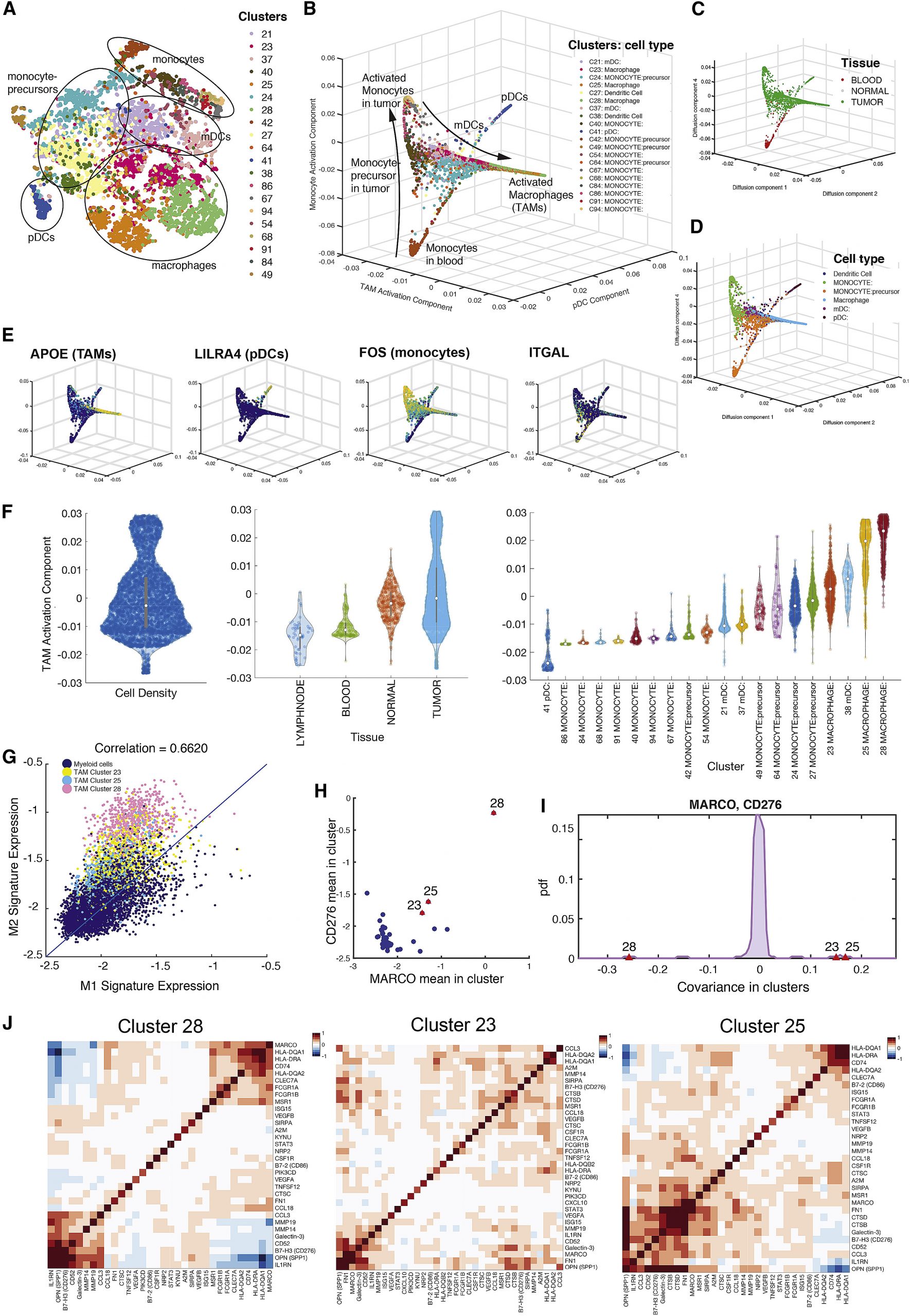 - (I) Distribution of covariance between MARCO and CD276 across all myeloid clusters. TAM clusters are marked in red and present substantial outliers. See Figure S7F for similar computation on the raw, un-normalized data, verifying the result.