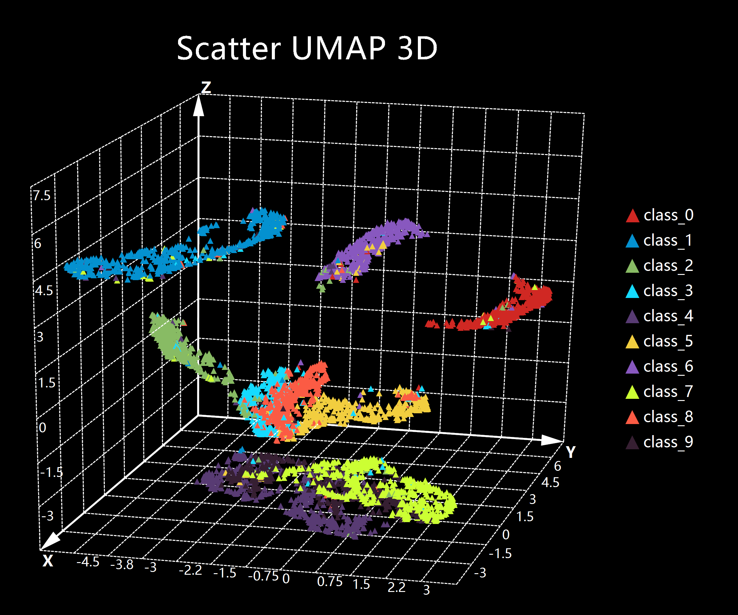 在进行三维散点图的可视化代码以及实现原理讲解之前,我们首先需要获取得到进行DEMO用的数据源进行测试。在这里我们使用之前进行UMAP降维方法所演示的MNIST数据集的三维降维结果来进行DEMO展示。在这里我们回顾一下进行三维的UMAP降维的脚本代码:R#