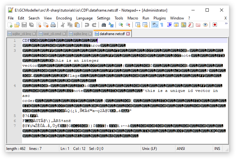 产生的CDF文件我们可以使用记事本软件打开查看,可以看到因为是二进制文件,所以记事本显示的是乱码。但是我们在写CDF文件的时候的一些名称,注释之类的字符串还是可以很清楚的阅读出来的: