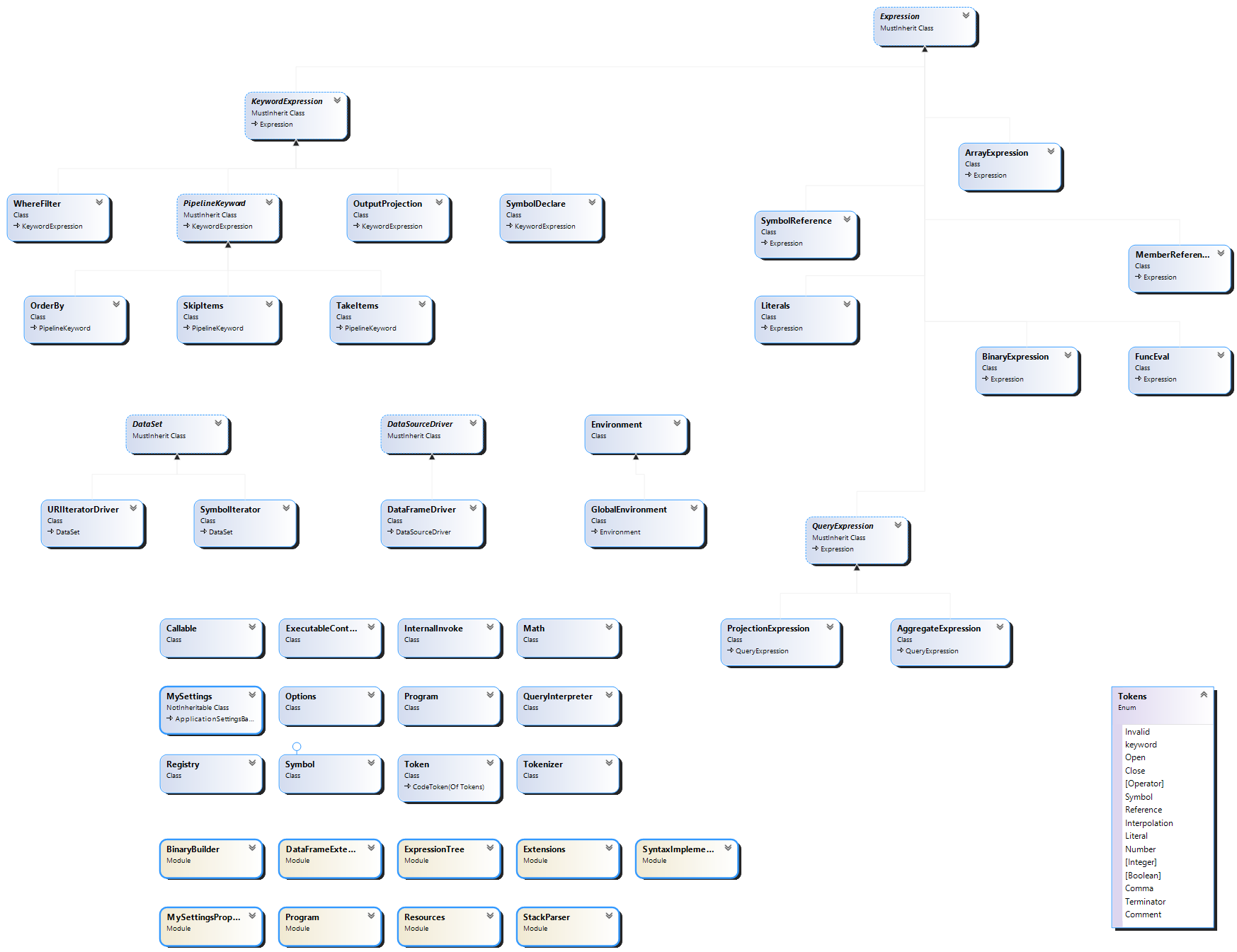 元表达式就是一般意义上的编程语言之中的表达式。在这个查询引擎之中,元表达式是以VisualBasic的语法为基础而解析的。也就是说,你几乎可以将VisualBasic源代码之中的LINQ查询表达式原封不动的复制出来,在这个查询引擎中执行。
