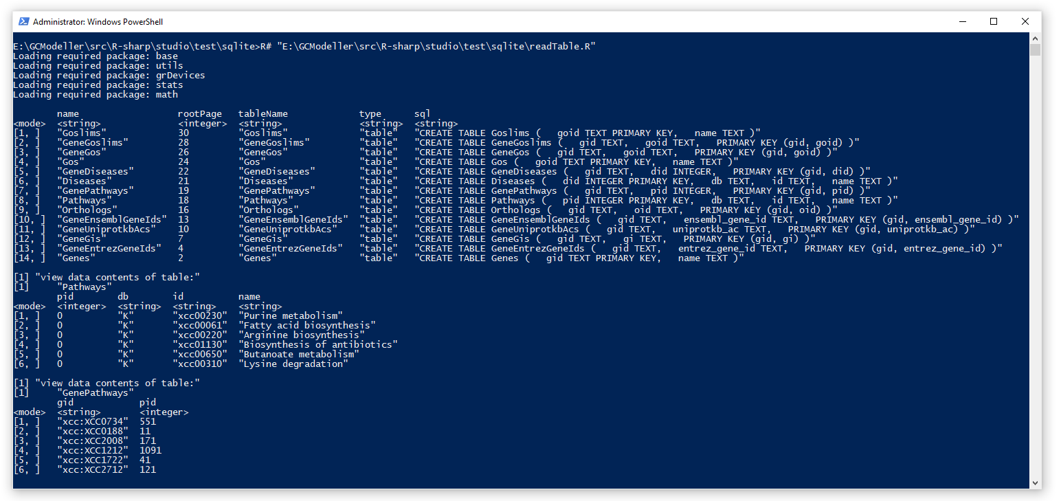 在执行LINQ脚本对Sqlite数据库的查询之前,我们首先使用R#环境之中所提供的开发者工具来看一下我们的数据库文件里面有哪些数据吧。在R#脚本之中,我们可以通过系统自带的sqlite程序包进行数据库文件内容的查看,例如: