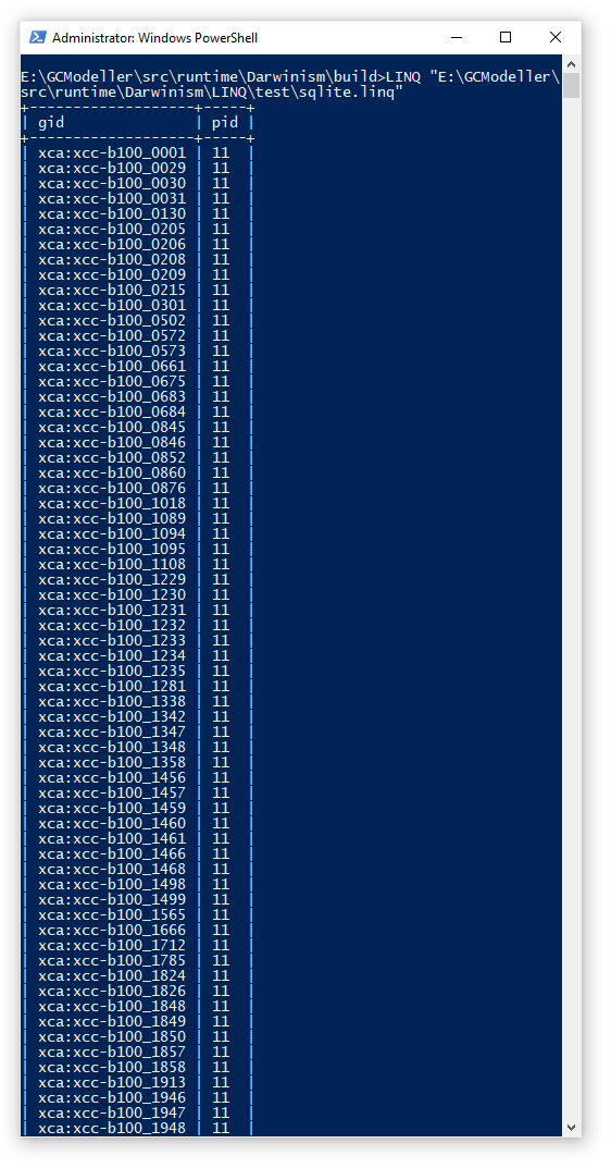 好的,我们将上面的demo查询脚本保存一下,通过LINQ命令执行一下。我们可以看到,LINQ查询解释器已经将所有的pid等于11的结果都筛选出来了: