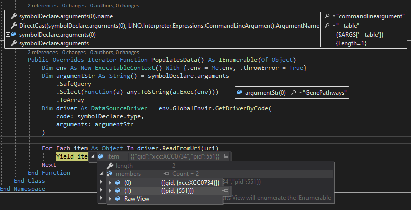 在VisualStudio之中调试一下上面的脚本,我们的解释器程序已经正确的从命令行参数--table之中得到"GenePathways"这个数据表名称了。
