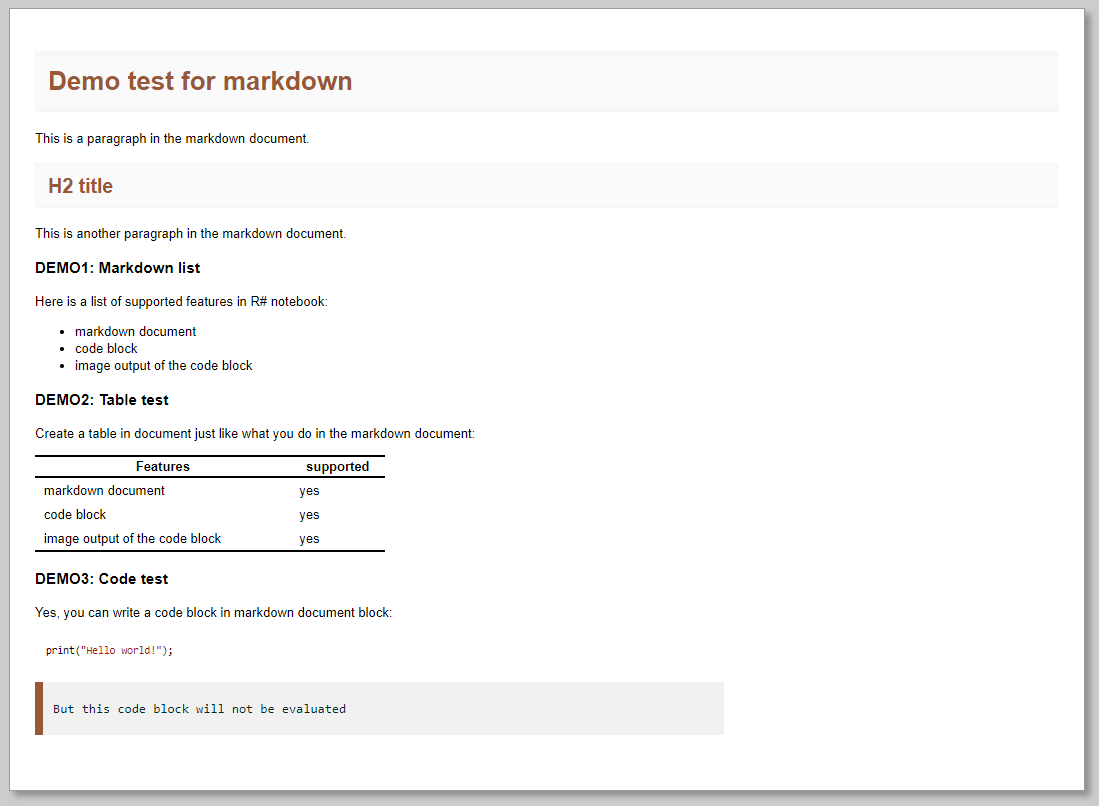 在R#脚本的文档化渲染之中,默认只支持markdown文档格式。所有的顶层注释代码都是markdown文档,所以我们只需要基于markdown语言,进行相应的注释代码块的编写即可。但是在这里和普通的R#脚本的注释编写有一个小小的不同之处就是,markdown文档与代码块文档的交界之处必须要有一个分号作为分隔符才行。例如:;