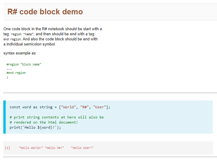 在进行文档化编写的时候,执行实际功能的代码块就和书写普通的R#脚本代码一样的进行代码文本的书写工作即可。只不过,这个所书写的代码块的前后多了一对一一对应的标签用来进行分隔。这个标签的语法与VisualBasic.NET语言之中的region标签是保持一致的。例如R#