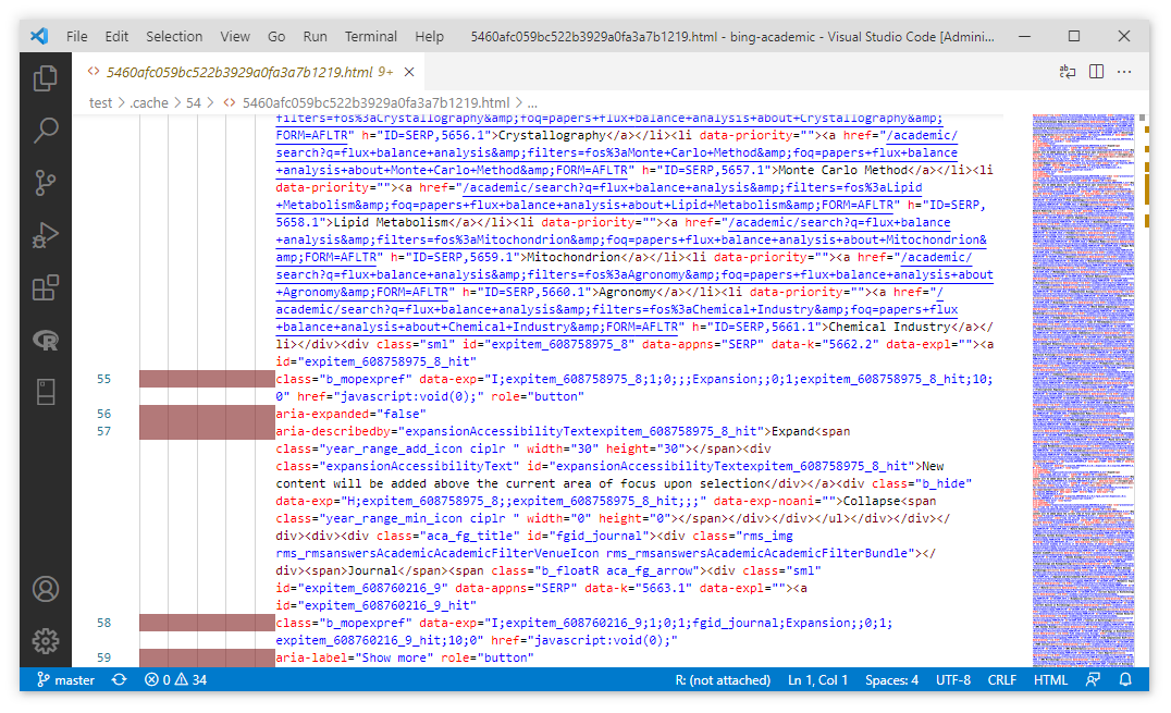 由于必应搜索的html页面是在后端通过模板渲染出来,并且传输经过了html页面压缩,所以我们直接用编辑器打开会十分的凌乱。但是没有关系,因为页面中存在这解析操作的一些必要的标记信息,所以通过graphquery脚本我们任然可以很轻松的对信息数据进行查询。