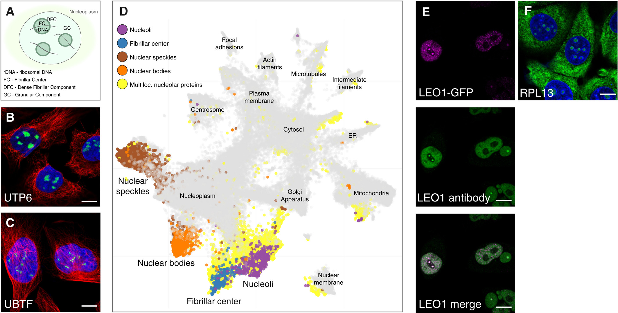• UMAP visualization of the IF images generated in the HPA Cell Atlas (also shown in Fig 3A). The images from singularly localizing nuclear proteins are highlighted in purple (nucleoli), blue (fibrillar center), brown (nuclear speckles), and orange (nuclear bodies). Multilocalizing nucleolar proteins are highlighted in yellow.