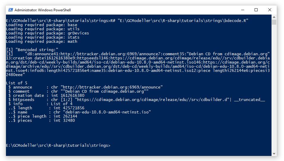 我们将上面的B编码结果字符串,使用R#脚本中的bdecode函数进行反序列化,看一下结果是不是上面描述的那样: