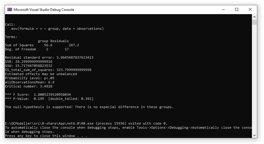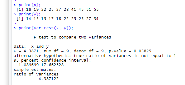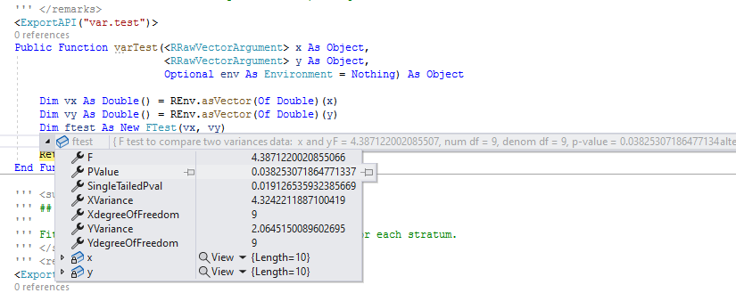 根据F检验的定义,我们可以简单的实现一下对应的统计方法;然后在环境之中测试一下,Pvalue结果值是和R语言之中的F检验结果是一致的。R#
