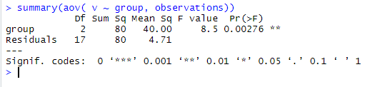 在进行实际的ANOVA计算的时候,我们得到的组别结果数据,一般会首先进行组内部的均值的计算,下面的代码展示了组内的均值计算过程: