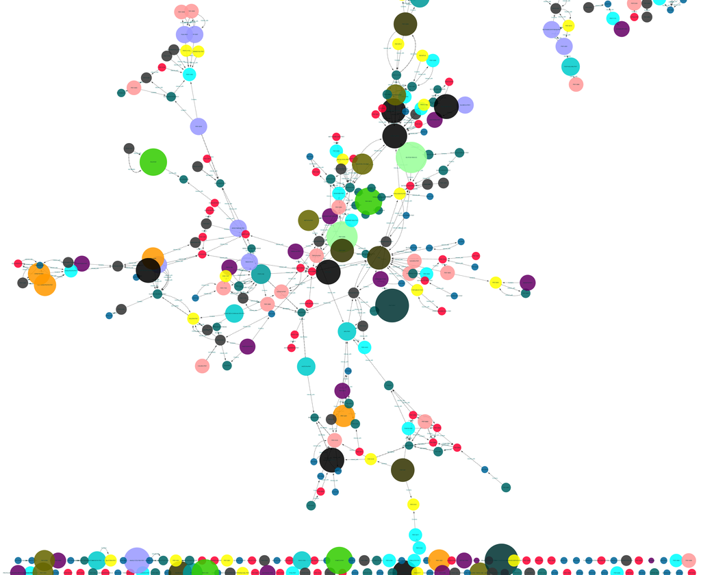 然后基于上面的计算过程,我们对所有的基因表达结果数据进行两两配对计算,就可以得到一个相关性矩阵。在相关性矩阵之中,一个由所确定的单元格的值就是一条网络边,边的两端x和y就是两个基因节点。基于一定的相关性系数的阈值,对这个[x,y]n*n大小的相关性矩阵进行元素删除,基于剩下的元素就可以构建出一个相关性网络图了。