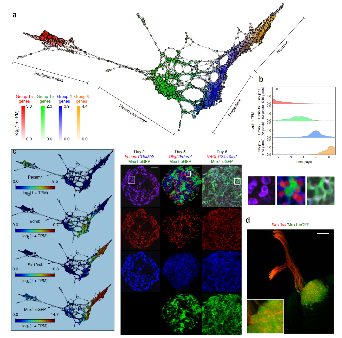 Figure 4 Cellular populations during motor neuron differentiation. (a) scTDA identifies four transient populations in mESC differentiation into MNs. Represented is the topological representation (colored by mRNA levels) of four groups of low-dispersion genes: pluripotent, precursor, progenitor, and postmitotic populations. In total, 488 genes were assigned to one of these four populations based on their expression profiles in the topological representation. TPM, transcripts per million. (b) Reconstructed expression timeline for each of the four groups of low-dispersion genes. (c) Validation by detection of state-specific cell-surface markers identified by scTDA. Left, topological representation (colored by mRNA levels) of surface proteins Pecam1, Ednrb, and Slc10a4; right, immunostaining of cultured EBs. Scale bar, 50 μm. Details of three regions are presented at the far right. For reference, the topological representation colored by mRNA levels of the Mnx1-eGFP reporter is also shown. (d) In vivo validation of the motor neuron surface marker Slc10a4. Spinal cord section from an E9.5 mouse immunostained for Slc10a4 (red). The pool of motor neurons is also marked by Mnx1-eGFP expression (green). Scale bar, 50 μm.