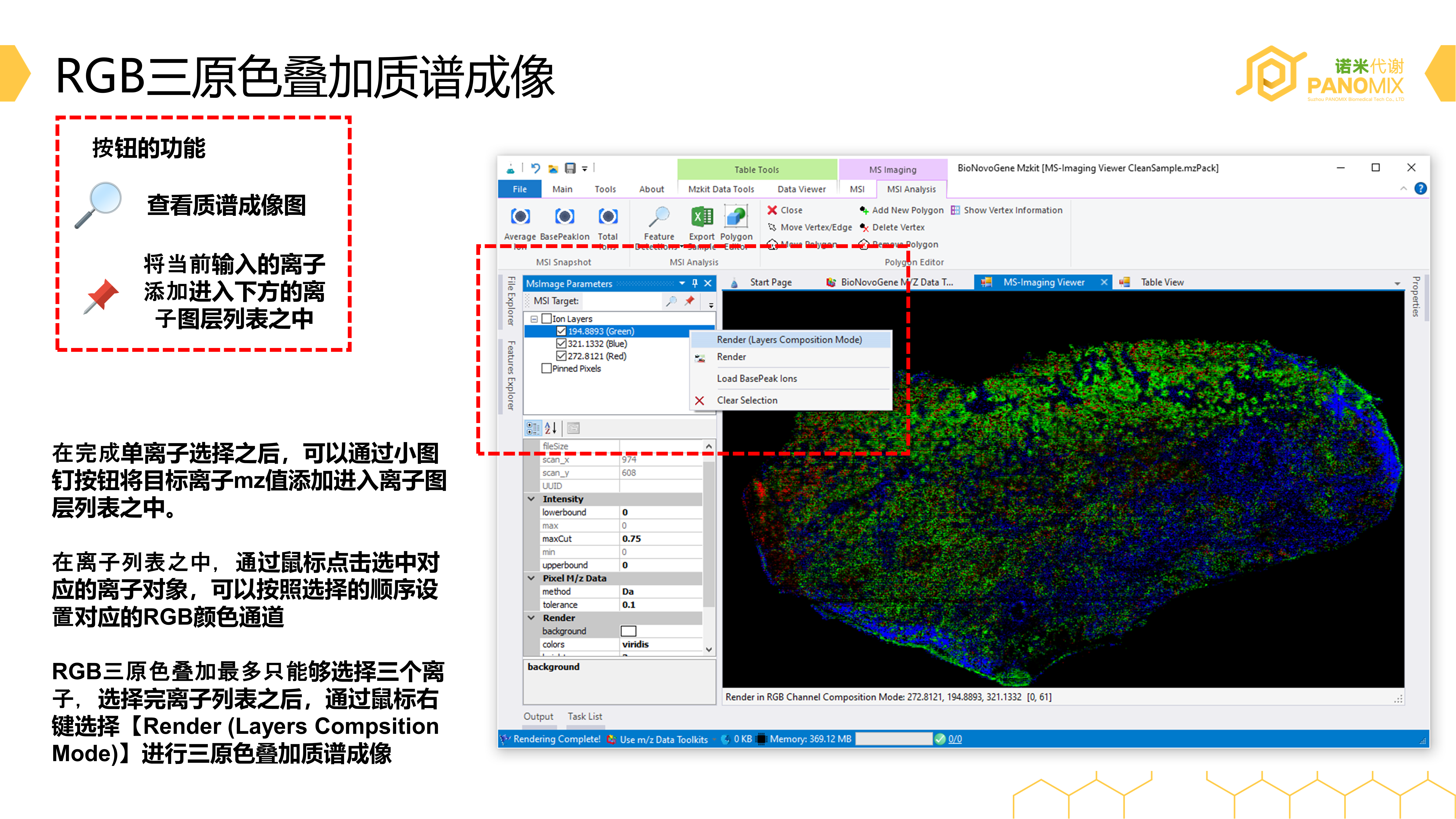 在前面我们介绍的质谱成像可视化,都是基于将离子信号直接通过线性变换映射到一个颜色列表来实现可视化的。一般这种情况我们仅仅能够可视化一种离子或者多种离子的信号混合的结果。如果我们需要将有限的几种离子进行叠加显示,查看目标离子在分布区域上的差异性呢?