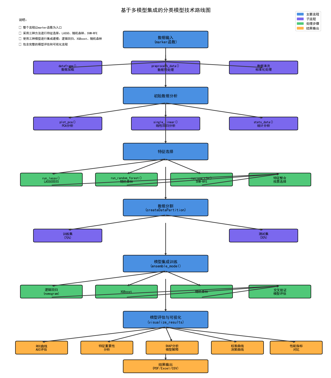 本程序包是一个基于R语言的综合性机器学习工具集,专门设计用于生物标志物发现和疾病预测模型的构建。该工具整合了多种机器学习算法,提供了从数据预处理、特征选择到模型构建与验证的完整工作流程,特别适用于代谢组学、基因组学等高维生物数据的分析研究。在这个程序包中,主要是通过marker函数来封装了从数据与处理到模型建立的每一个步骤,主要将程序包划分为了以下的工作步骤模块: