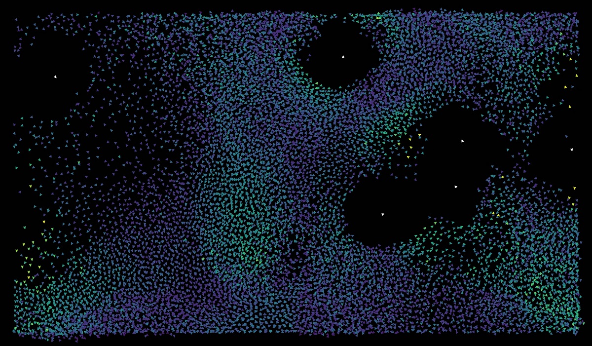 在拥有了上面的模拟算法代码之后,我们就可以计算出每一个Boid的速度方向,通过循环进行迭代计算更新位置,即可实现整个模拟计算的逻辑了。在每一次完成了位置的更新后,我们可以通过对应的绘图代码来进行图像的渲染更新。在这里,我们将每一个Boid的速度向量提取出来,按照热图的渲染规则进行颜色索引的计算,通过特定的颜色版对计算出来的每一个颜色索引都赋予对应的热图颜色,就可以得到最终的粒子模拟计算渲染结果了。