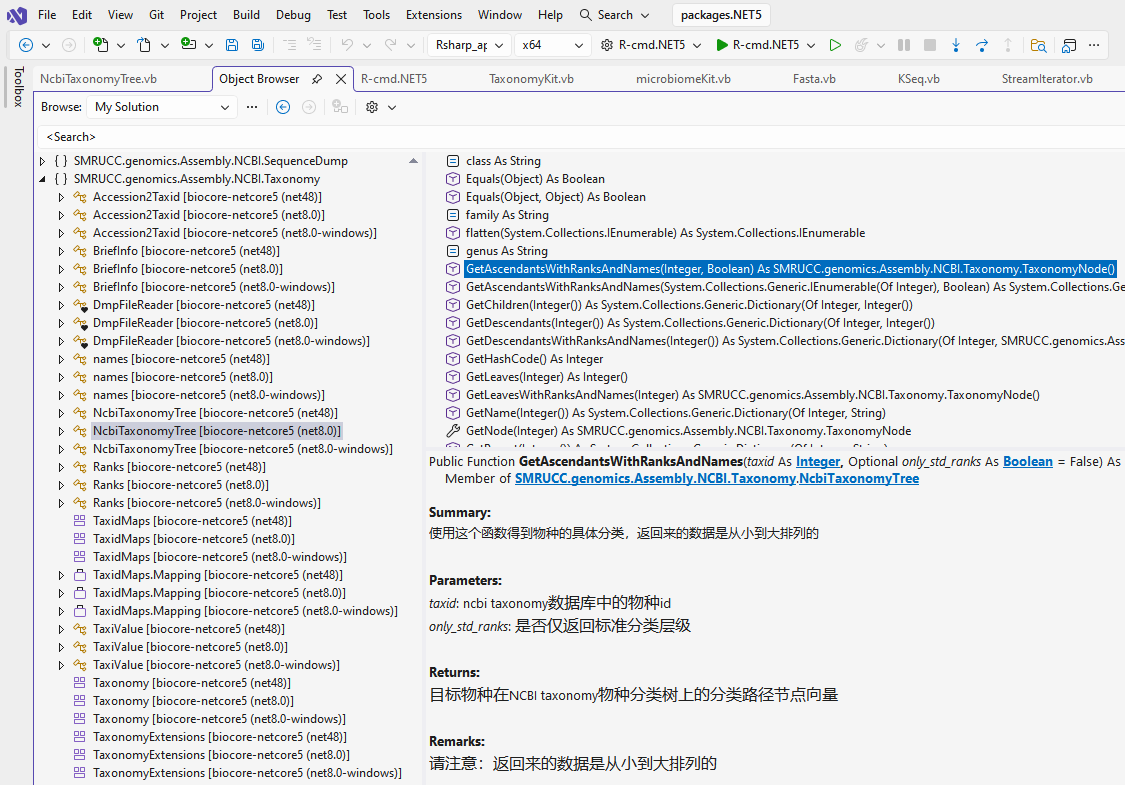 将上面所描述的LCA算法导出为GCModeller程序中的一个工具函数后,我们就可以在R#脚本语言中进行相关的LCA祖先节点的计算,下面为一个demo脚本: