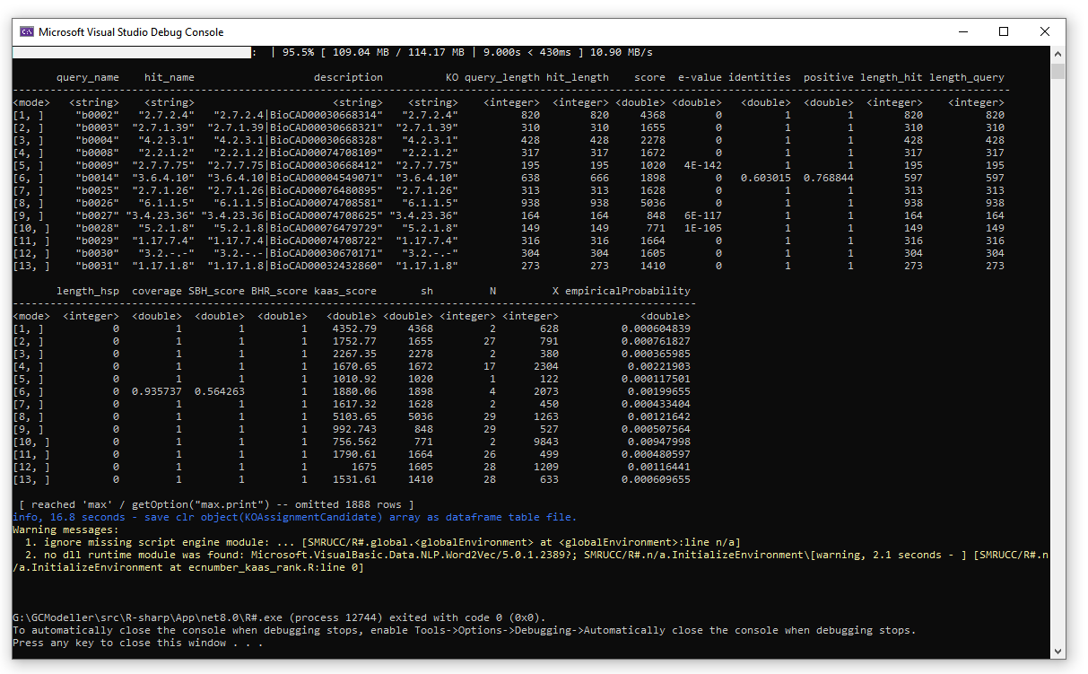 那现在,我们将上面测试的注释流程的R#脚本代码中的kaas_rank参数修改为TRUE,则整个流程将会走首先进行BHR评分过滤,然后再在BHR评分过滤的基础上完成KAAS Rank Assignment Score的计算,实现出一个更加灵活严谨的直系同源注释流程。在这里所示的BHR+KAAS Rank的流程将会生成下面所示的结果数据框: