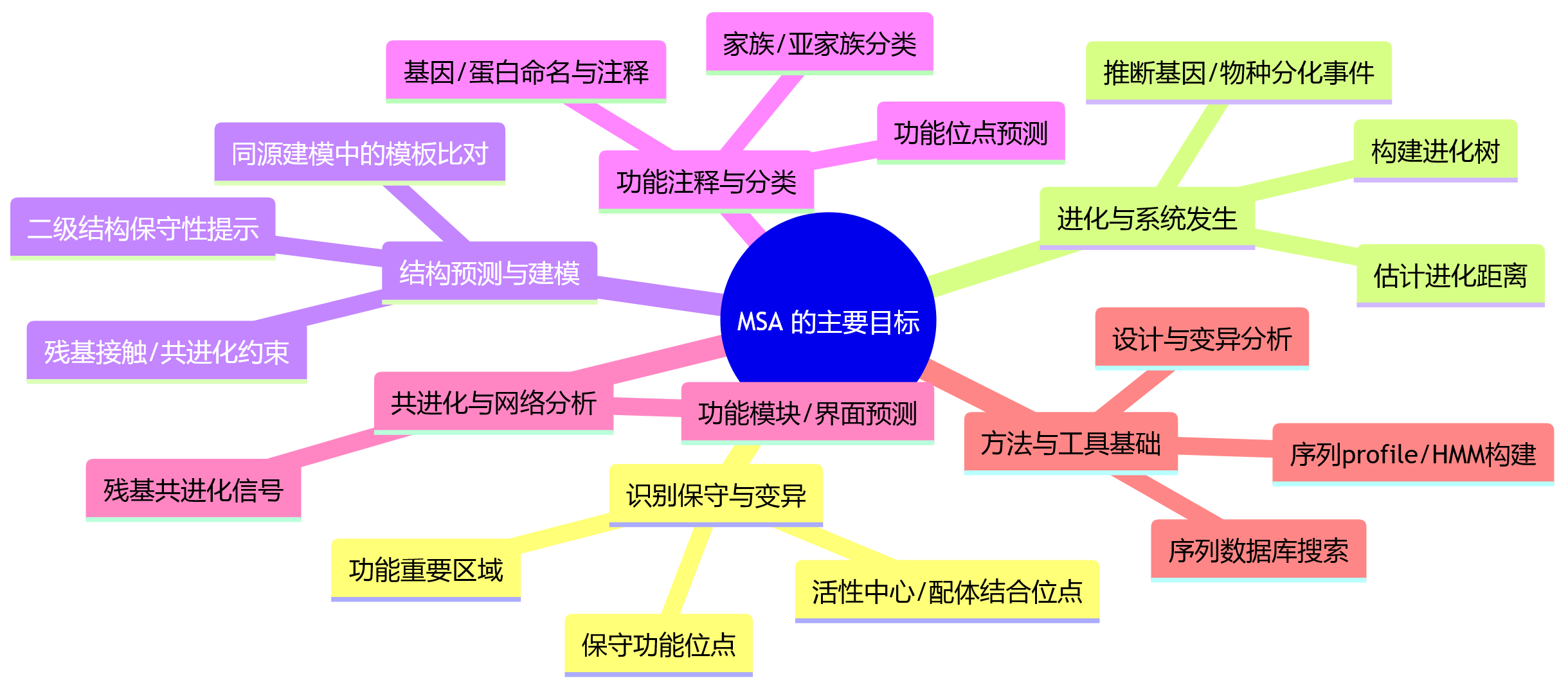 MSA(多序列比对)在生物信息学中的核心目标是:通过把多条同源序列“对齐”,来突出它们之间的相似与差异,从而帮助我们:识别保守区/功能位点、推断进化关系(系统发生)、预测或解释蛋白质/核酸结构、发现共进化与功能模块,以及为后续分析(如模体搜索、结构建模、从头设计等)提供基础。基于多序列比对分析,我们可以通过这种算法,把一堆表面看上去“乱糟糟”的序列,整理成一个可以“逐位点比较”的框架。基于我们所得到的这个框架基础,我们可以进行下游的后续分析,例如: