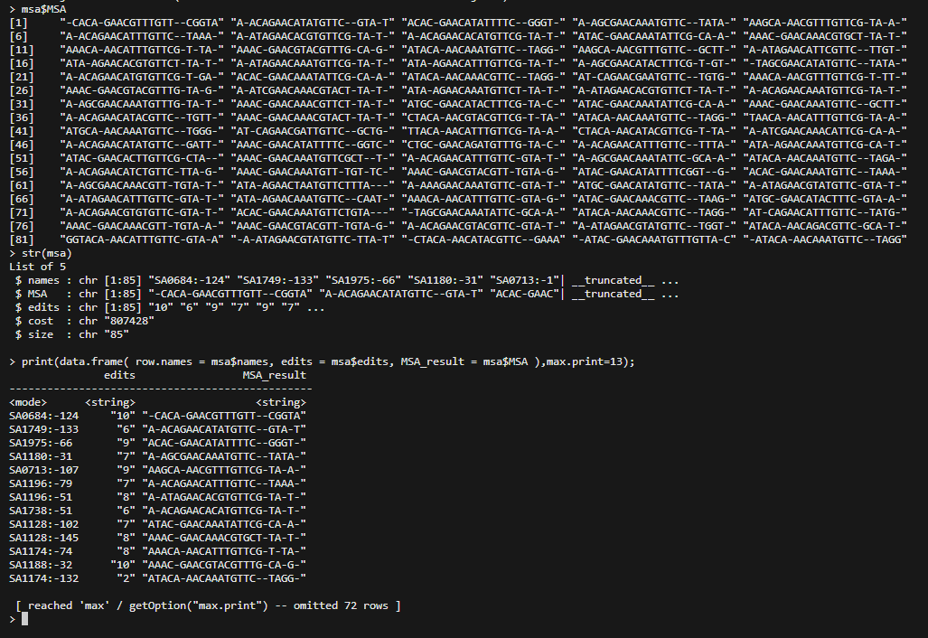 运行上面的测试代码,脚本会首先读取测序所需要的fasta序列数据,然后进行多序列比对。得到多序列比对结果对象之后,会基于对齐后的多序列数据进行每一个位点上的碱基频率的统计,进行sequence logo的绘制,来可视化我们的多序列比对结果。同时,上面的脚本还会将多序列对齐结果导出为json文件,以方便进行下游分析。我们也可以直接在R#环境中查看上面的操作所产生的多序列对齐结果。